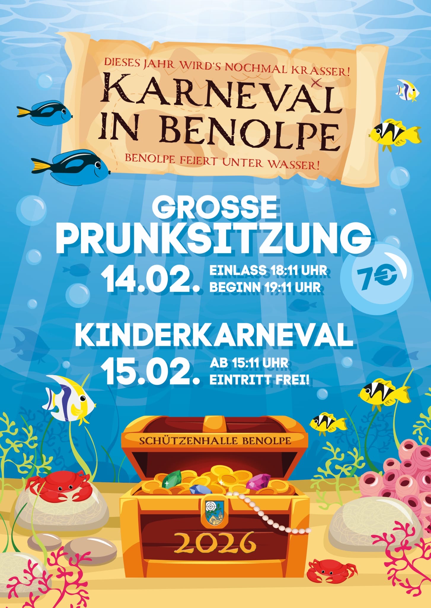 Die fünfte Jahreszeit beginnt schon früh in diesem Jahr! Der Schützenverein Benolpe lädt wieder alle Jecken zur großen Prunksitzung am Großsamstag, dem 14.02.2026, in die prächtig geschmückte Schützenhalle ein. Einlass ist 18:11 Uhr, Beginn der Veranstaltung 19:11 Uhr.